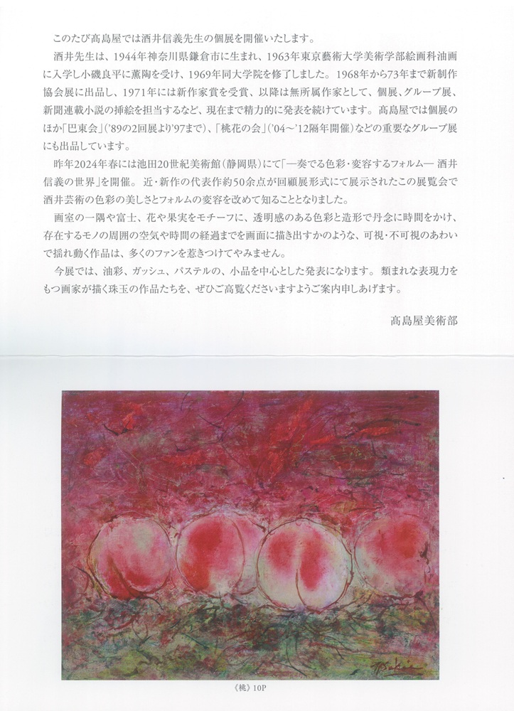 絵画専攻 酒井信義元教授の個展のご案内です。詳細は下記のホームページよりご覧ください